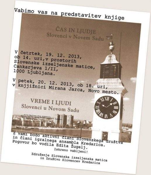 Vljudno vabljeni na predstavitev knjige o Slovencih v Novem Sadu, v četrtek, 19. 12. 2013 ob 14. uri, v prostorih...